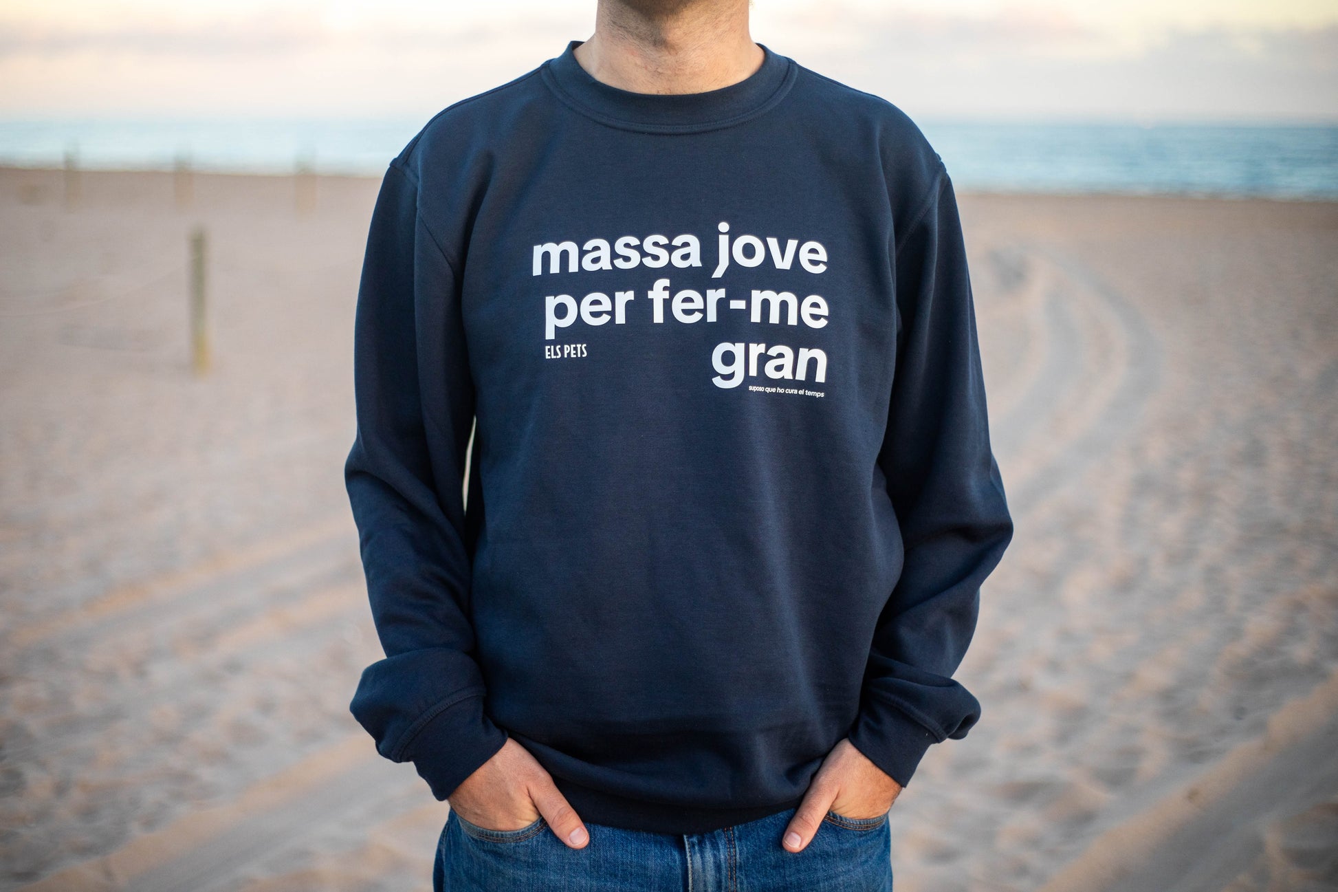 Dessuadora en color blau fosc amb la frase "Massa jove per fer-me gran / suposo que ho cura el temps".